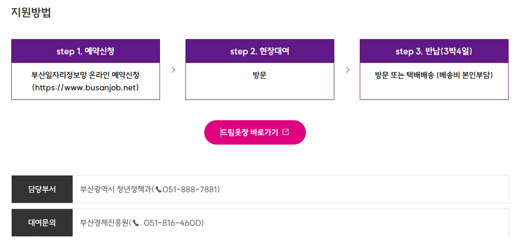 - 추천, 통화로 면접을 통보받은 경우 : 구직활동 내역서 or 입사지원 증빙자료 + 통화내역 캡쳐(번호필수) - 지원방법 : 부산일자리정보망(http://www.busanjob.net) → 청년부산잡스 → 드림옷장 예약 신청 → 담당자 승인 → 신청기관 방문 대여 → 대여자 사용 후 반납