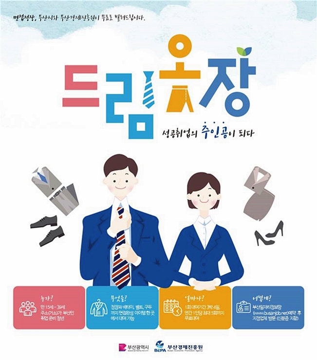 드림옷장 : 부산시에 거주하는 청년 구직자 및 부산소재 기업에 취업 준비를 하는 청년들에게 면접용 정장을 무료로 대여해주는 사업입니다. 단정하고 신뢰감 있는 인상을 남기기 위해 중요한 면접 복장을 경제적 부담 없이 준비할 수 있도록 도와주는 제도입니다.