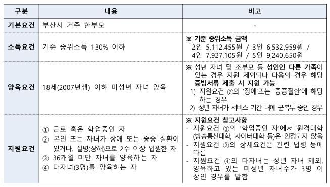 ○ 신청대상: 기본, 소득, 양육요건을 모두 충족하면서 지원요건 1개 이상 해당하는 자