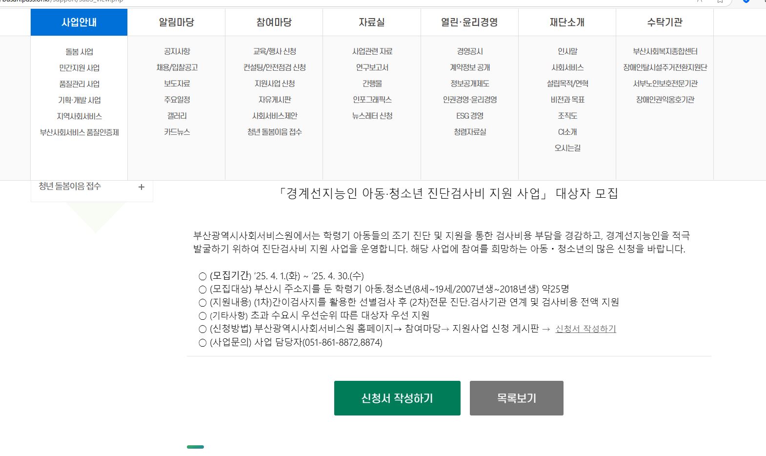 부산광역시사회서비스원 홈페이지→ 참여마당→ 지원사업 신청 게시판→  신청서 작성하기