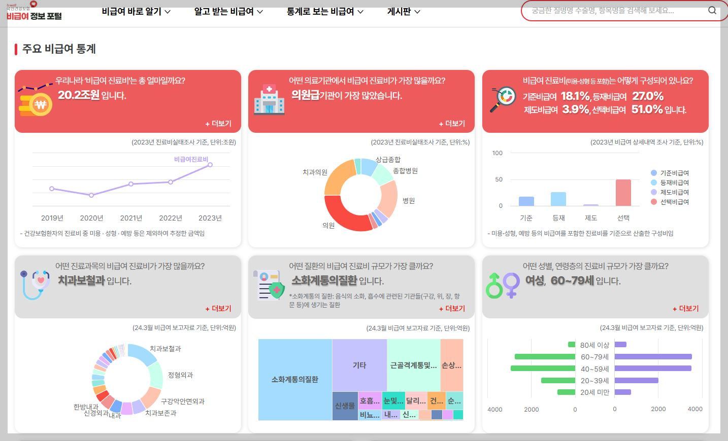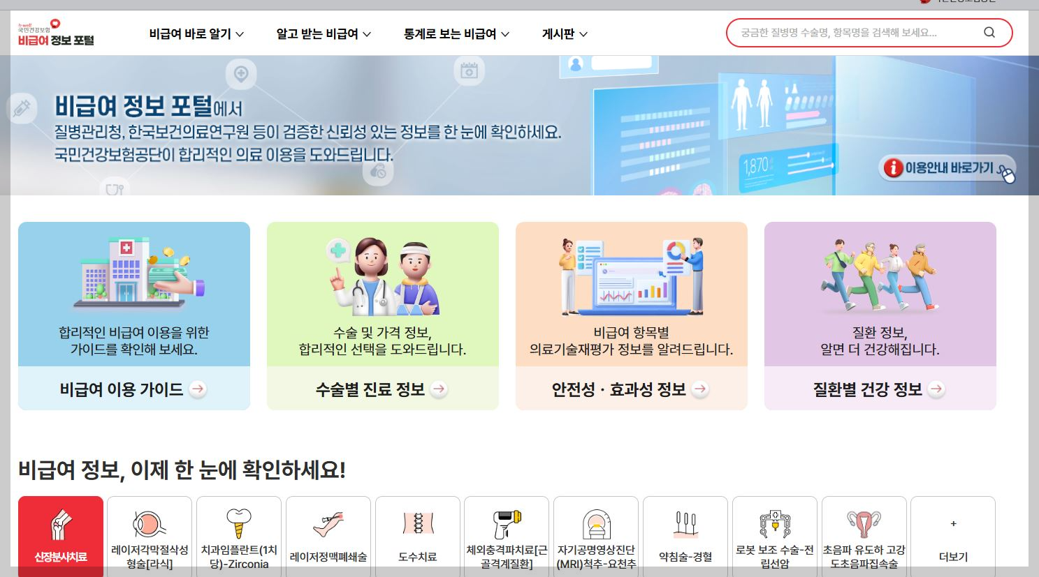 이에 국민건강공단은 국민들의 의료 선택에 도움을 주고자 비급여 항목의 가격 정보뿐만 아니라 주요 항목의 안전성‧효과성 정보, 질환별 증상‧치료 정보 등을 종합적으로 제공하기 위해 <비급여 정보 포털>을 구축하였습니다. (개설 2025년 4월 10일)