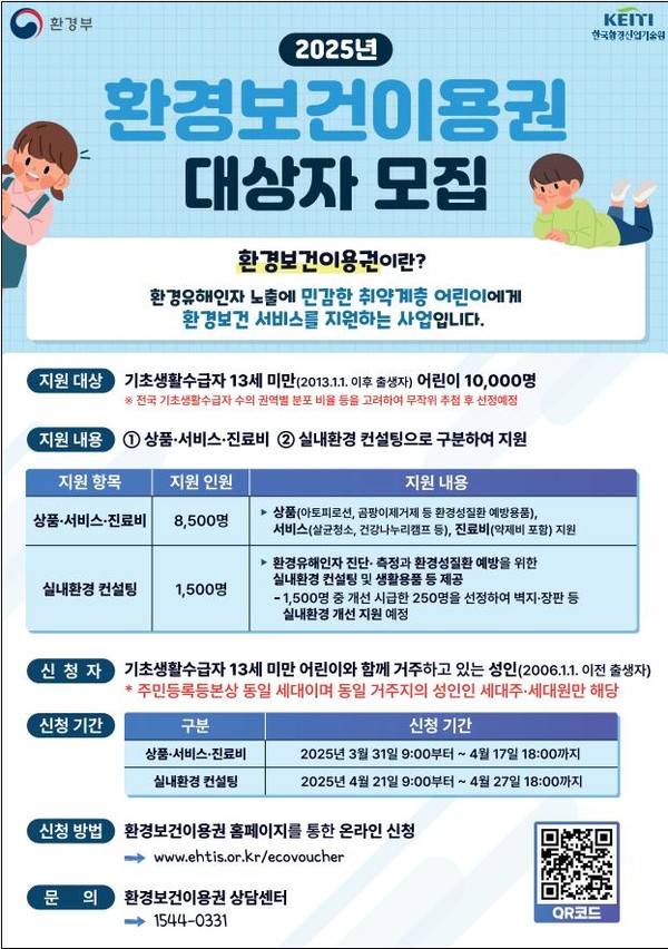 25년 3월 31일부터 기초생활수급자 가구 13세 미만 어린이를 대상으로 10만 원 상당의 환경보건서비스 혜택을 지원합니다.