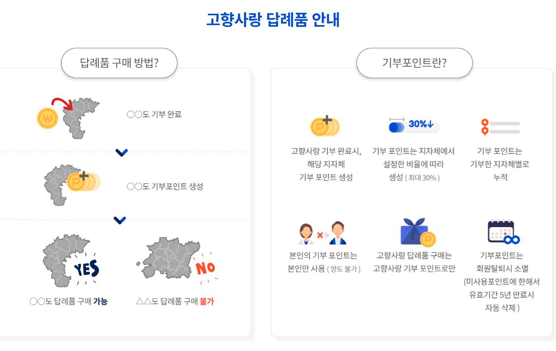 - 답례품 지급 : 고향 사랑 기부포인트를 받게 되고, 지자체 쇼핑몰에서 기부금의 30%에 해당하는 금액만큼 구매가능합니다. 지역마다 특산품 위주로 답례품이 구성되기 때문에 특정 답례품을 선호하는 경우, 해당 지역에 기부하는 것이 이득입니다. 최근에는 지자체마다 고향사랑기부제 답례품 후기 이벤트를 진행하는데, 기부하고 추가 혜택도 받을 수 있습니다.
