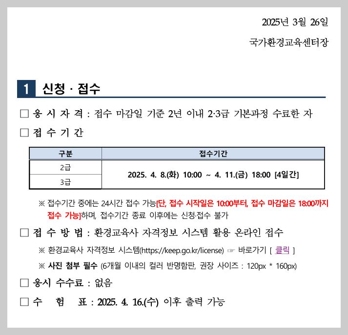 2025년 올해의 경우 제1 차 환경교육 필기시험