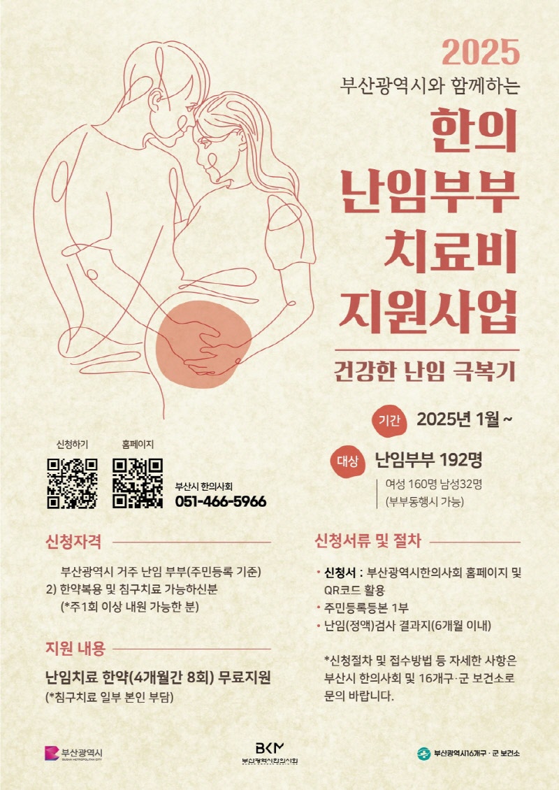 아이를 간절히 원하는 많은 부부에게 ‘난임’은 심리적, 경제적으로 큰 부담이 될 수밖에 없습니다. 특히 반복된 시도와 치료과정에서 겪는 육체적·정신적 스트레스는 말로 다 표현하기 어려운데요. 이러한 어려움을 조금이나마 덜기 위해 부산시에서는 난임부부를 위한 한의약 치료비 지원사업을 운영하고 있습니다. 오늘은 이 사업에 대해 자세히 알려드릴게요!