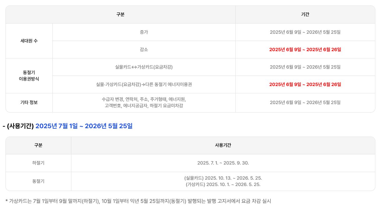 ※25년부터는 지원금액이 동·하절기 구분없이 사용기간 내 자유롭게 사용 가능하므로, 하절기에 바우처를 사용하지않고, 동절기에 몰아서 사용하기를 희망하는 경우에는 하절기 요금 미차감 신청 필요